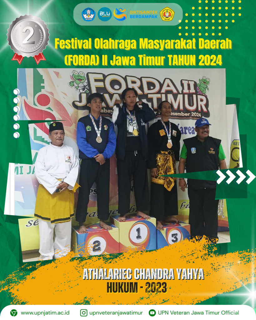 Surabaya – Prestasi membanggakan kembali ditorehkan oleh mahasiswa Universitas Pembangunan Nasional “Veteran” Jawa Timur. Athalariec Chandra Yahya, mahasiswa Fakultas Hukum, berhasil meraih juara II Pencak Silat Kategori Seni dalam ajang Festival Olahraga Daerah (Forda) Jawa Timur IIyang digelar pada 29 November hingga 4 Desember 2024.