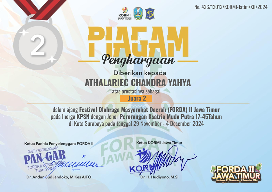 Juara II Kategori Senior Perorangan Ksatria Muda Putra Usia 17–45 Tahun pada Festival Olahraga Rekreasi Daerah (FORDA) II Jawa Timur