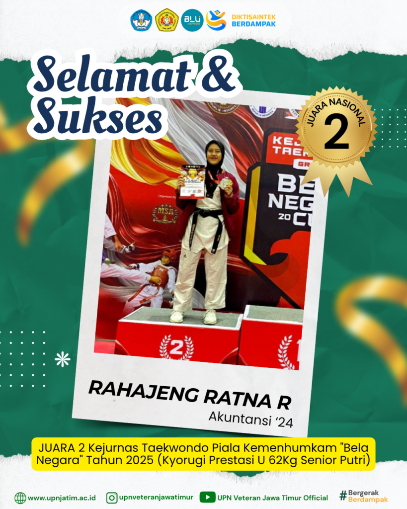 Surabaya – Mahasiswa UPN “Veteran” Jawa Timur, Rahajeng Ratna Rachmawati, berhasil meraih Juara 2 pada Kejurnas Taekwondo Piala Kemenhumkam “Bela Negara” Tahun 2025, kategori Kyorugi Prestasi U 62Kg Senior Putri, yang berlangsung pada 7–9 Februari 2025, di tingkat nasional.