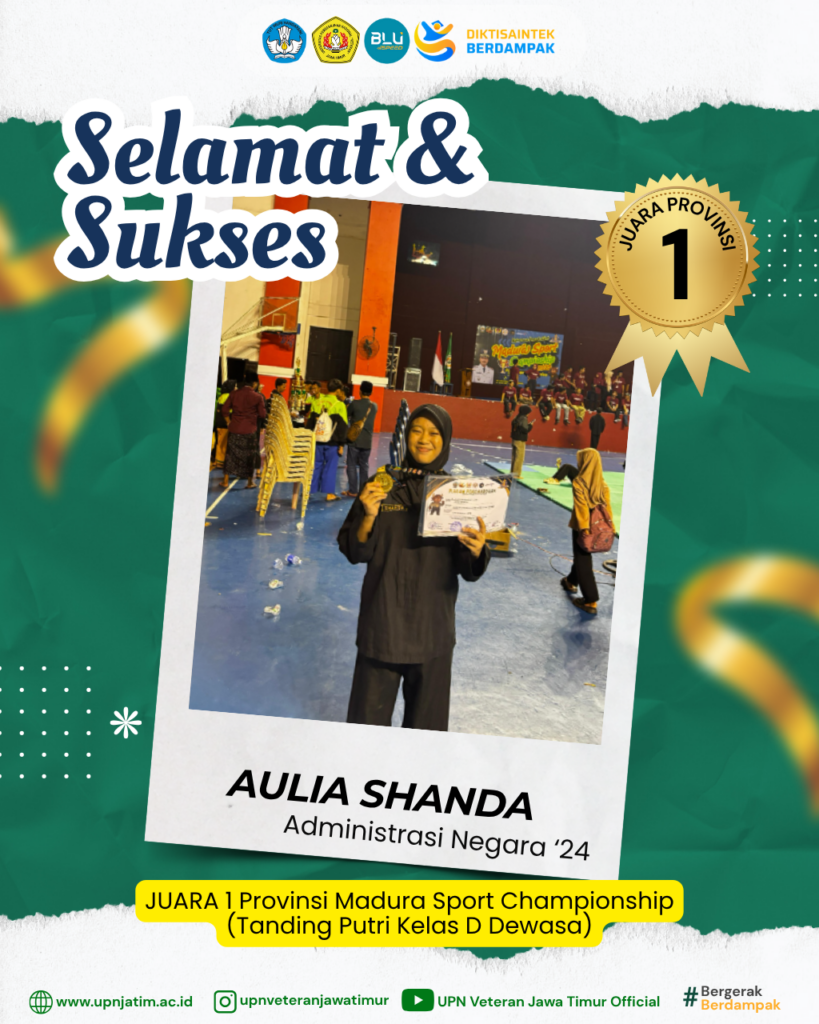 Surabaya – Mahasiswa UPN “Veteran” Jawa Timur, Aulia Shanda, berhasil meraih Juara 1 pada Madura Sport Championship 2025, kategori Tanding Putri Kelas D Dewasa, yang berlangsung pada 21–22 Juni 2025, diikuti peserta dari berbagai kabupaten/provinsi.