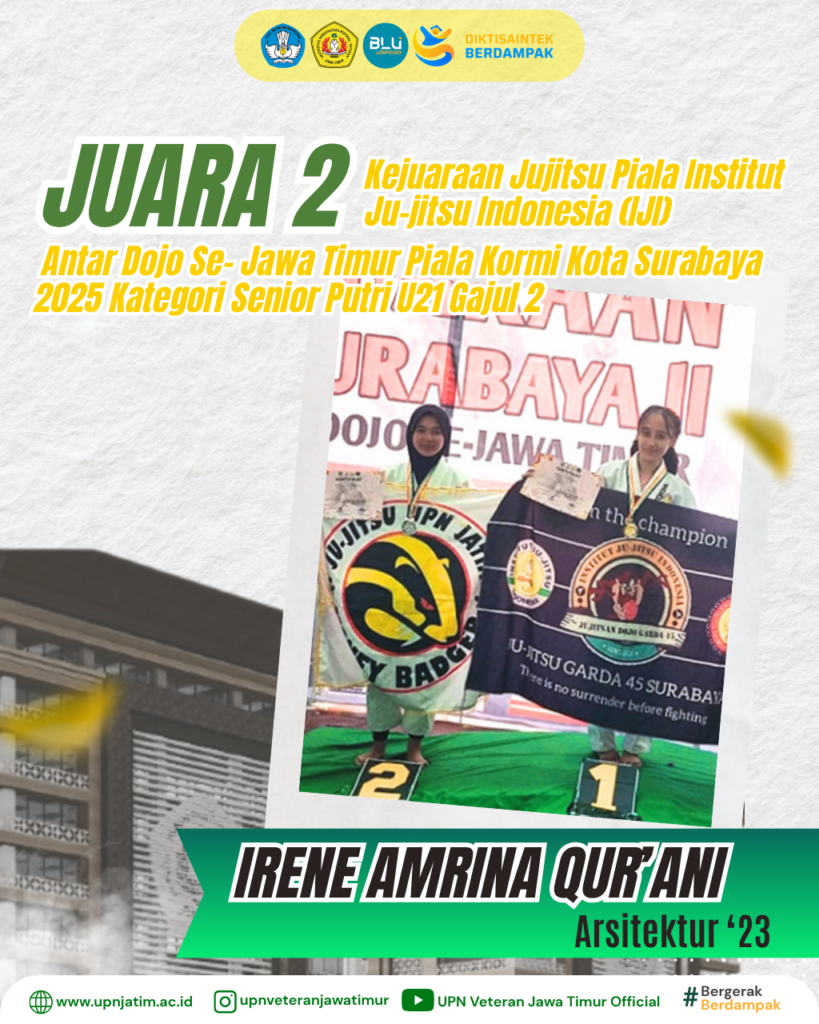 Surabaya – Mahasiswa UPN “Veteran” Jawa Timur, Irene Amrina Qur’ani dari Program Studi Arsitektur, berhasil meraih Juara 2 pada Kejuaraan Jujitsu Piala Institut Ju-jitsu Indonesia (IJI) Antar Dojo Se-Jawa Timur Piala Kormi Kota Surabaya 2025, kategori Senior Putri U21 Gajul 2, yang berlangsung pada 5–7 September 2025, diikuti peserta dari berbagai dojo di Jawa Timur.