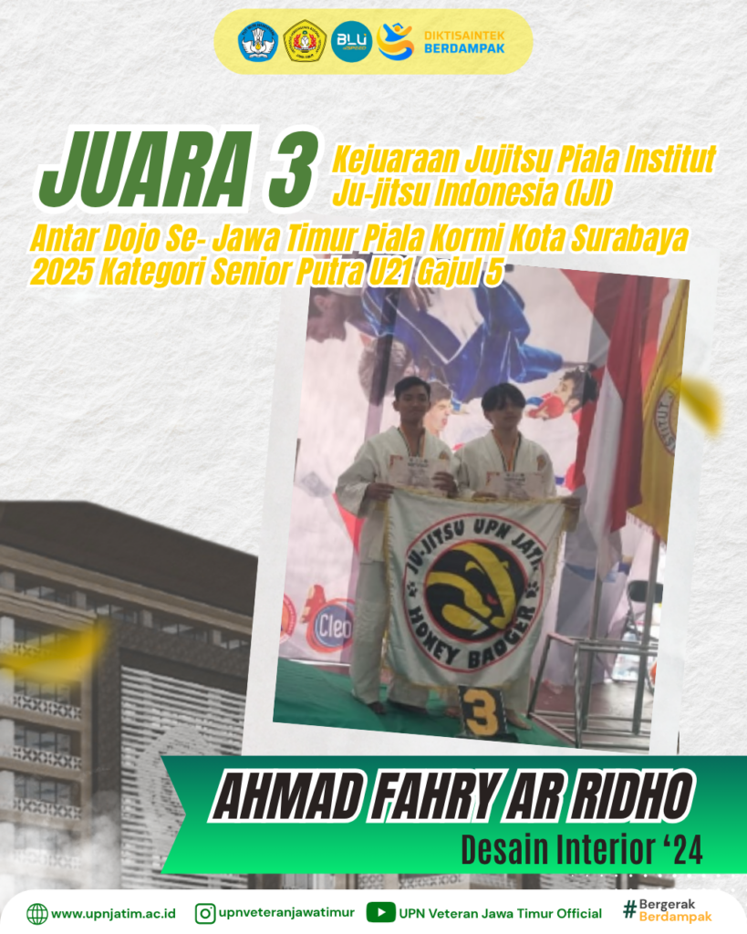 Surabaya – Mahasiswa UPN “Veteran” Jawa Timur, Ahmad Fahry Ar Ridho dari Program Studi Desain Interior, berhasil meraih Juara 3 pada Kejuaraan Jujitsu Piala Institut Ju-jitsu Indonesia (IJI) Antar Dojo Se-Jawa Timur Piala Kormi Kota Surabaya 2025, kategori Senior Putra U21 Gajul 5, yang berlangsung pada 5–7 September 2025, diikuti peserta dari berbagai dojo di Jawa Timur.