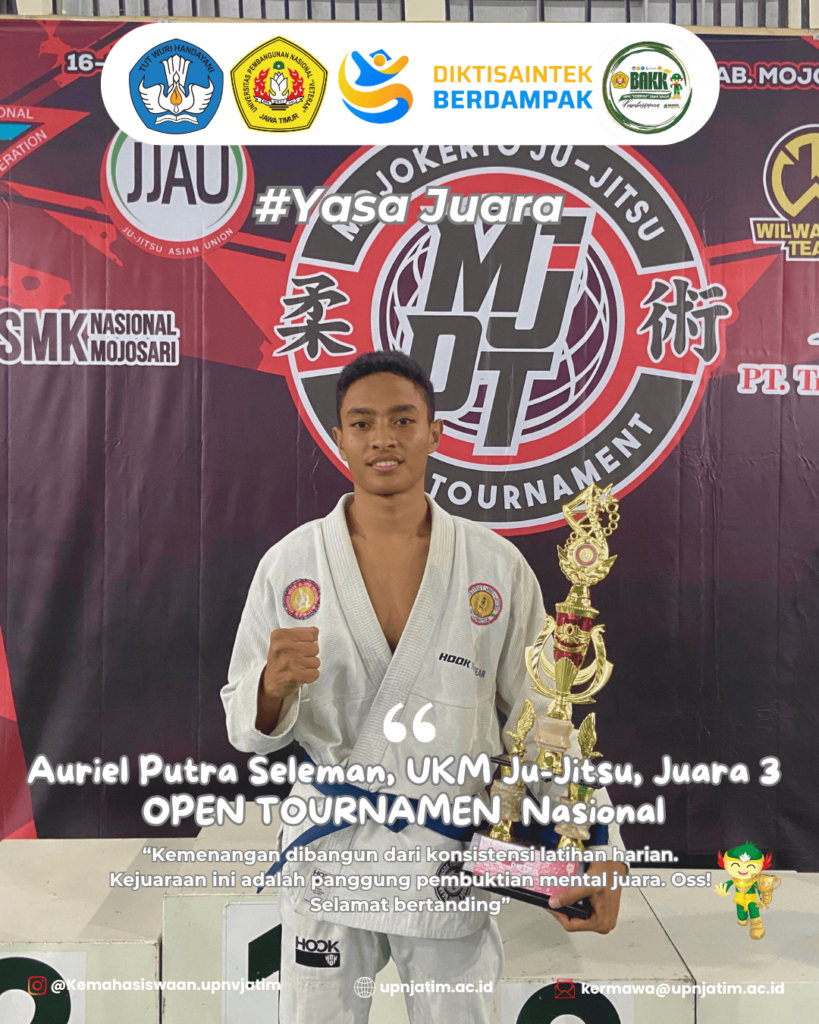 SURABAYA — Prestasi gemilang kembali dipersembahkan oleh atlet-atlet bertalenta dari Universitas Pembangunan Nasional (UPN) “Veteran” Jawa Timur. Auriel Putra Seleman, mahasiswa Program Studi Manajmen serta Aktif dalam mengikuti Unit Kegiatan Mahasiswa (UKM) Ju-Jitsu UPN Veteran Jawa Timur, berhasil meraih  Juara 3 Kategori Fighting Putra-69 Kg, diajang Open Tournament Nasional Piala KONI Kabupaten Mojokerto 2026 yang di selenggarakan pada tanggal 16 – 18 Januari 2026 di Gor Gajah Mada Mojosari, Mojokerto, Jawa Timur.