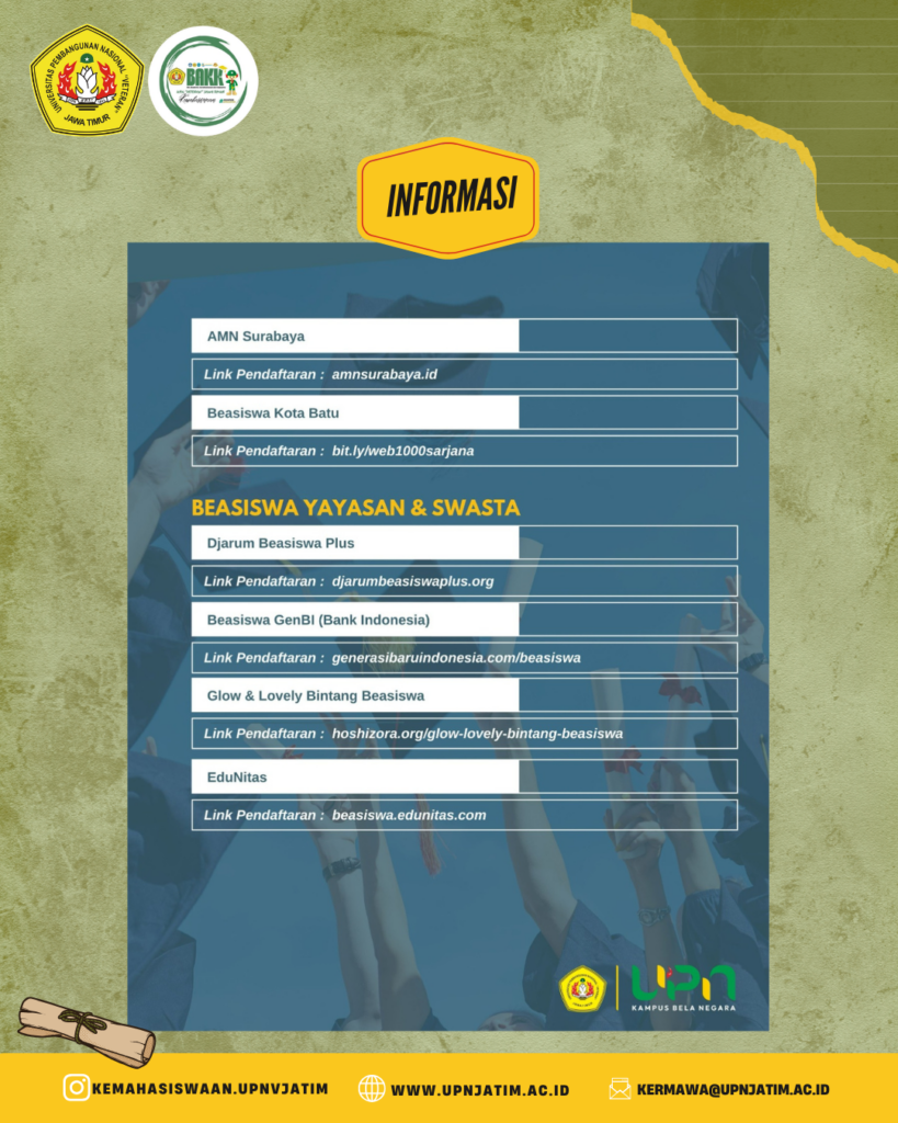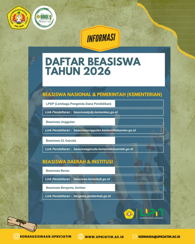 SURABAYA — Dalam rangka mendukung keberlanjutan pendidikan dan peningkatan prestasi mahasiswa, Universitas Pembangunan Nasional (UPN) “Veteran” Jawa Timur melalui Biro Akademik, Kemahasiswaan, dan Kerja Sama (BAKK) merilis daftar program beasiswa yang tersedia untuk periode tahun 2026.