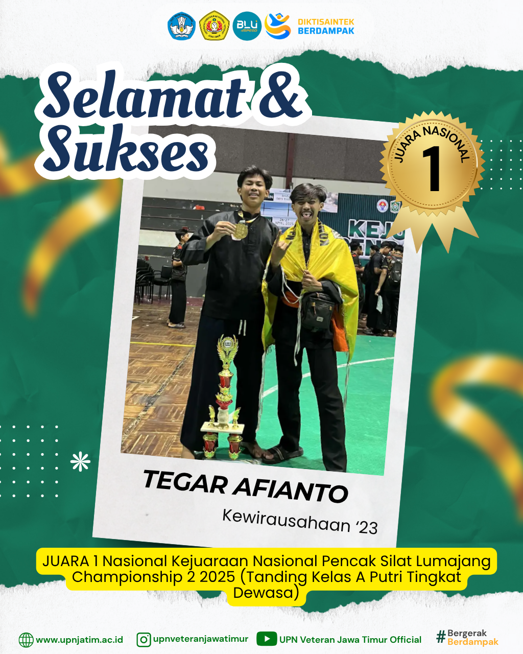 Surabaya – Mahasiswa UPN “Veteran” Jawa Timur, Tegar Afianto, berhasil meraih Juara 1 pada Madura Sport Championship 2025, kategori Tanding...