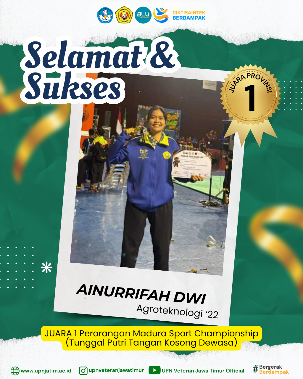 Surabaya – Mahasiswa UPN “Veteran” Jawa Timur, Ainurrifah Dwi Rahmawati, berhasil meraih Juara 1 pada Madura Sport Championship 2025, kategori...