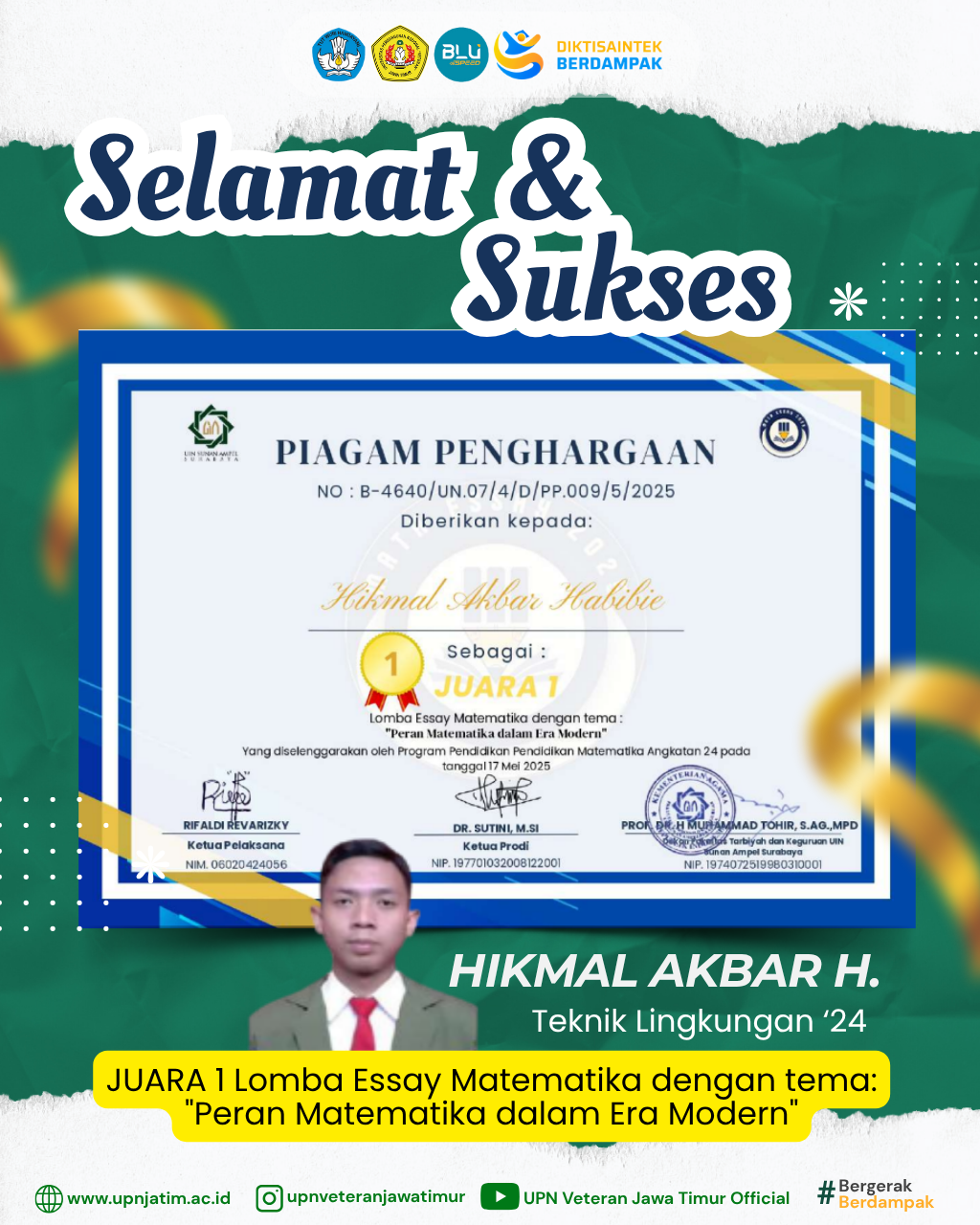 Surabaya – Mahasiswa UPN “Veteran” Jawa Timur, Hikmal Akbar Habibie, berhasil meraih Juara 1 pada Math Essay National 2025, yang...