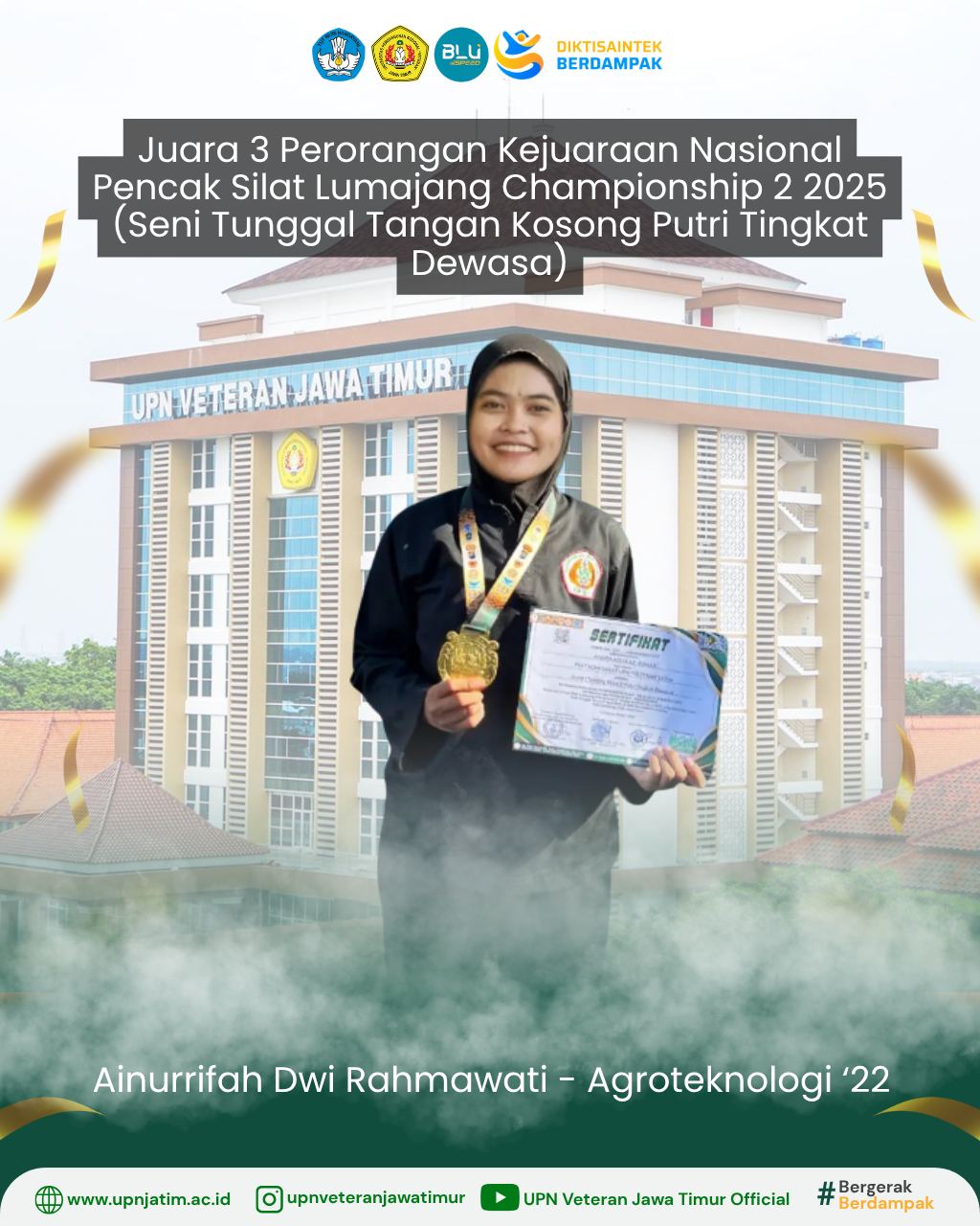 Surabaya – Mahasiswa UPN “Veteran” Jawa Timur, Ainurrifah Dwi Rahmawati, berhasil meraih Juara 3 pada Kejuaraan Nasional Pencak Silat Lumajang...