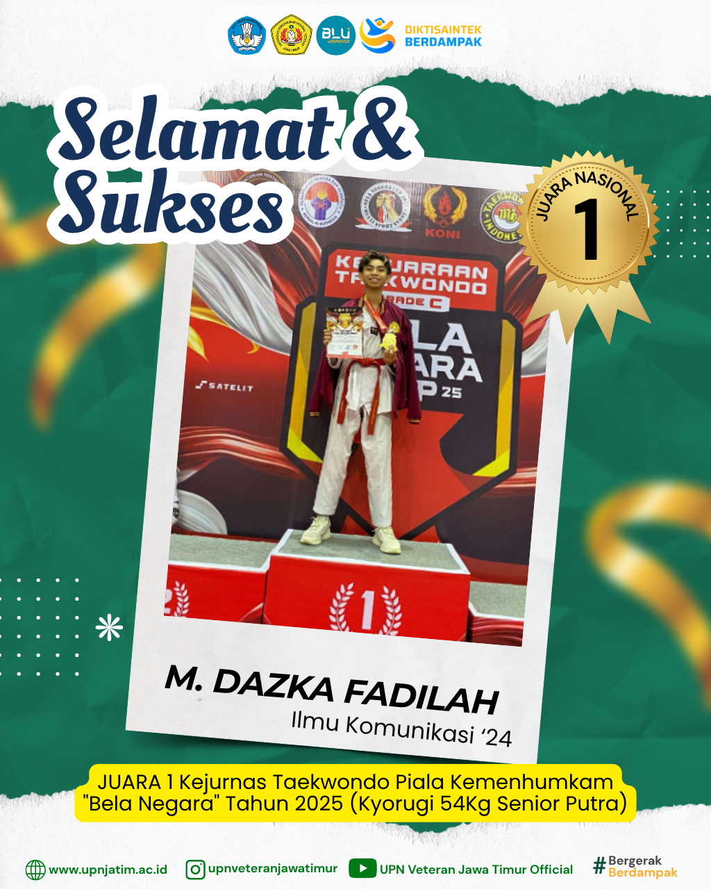 Surabaya – Mahasiswa UPN “Veteran” Jawa Timur, M. Dazka Fadilah, berhasil meraih Juara 1 pada Kejurnas Taekwondo Piala Kemenhumkam "Bela...
